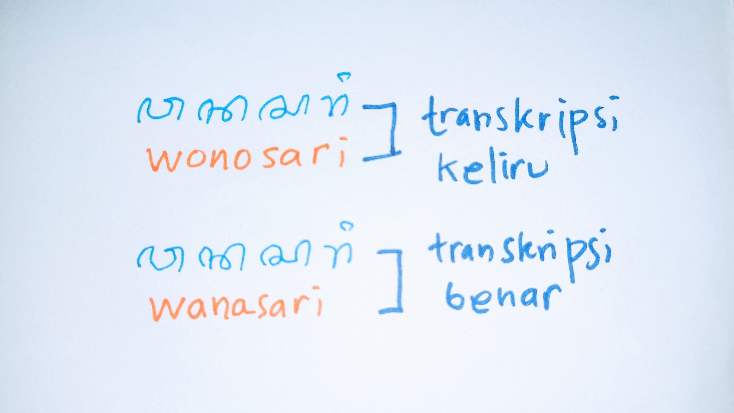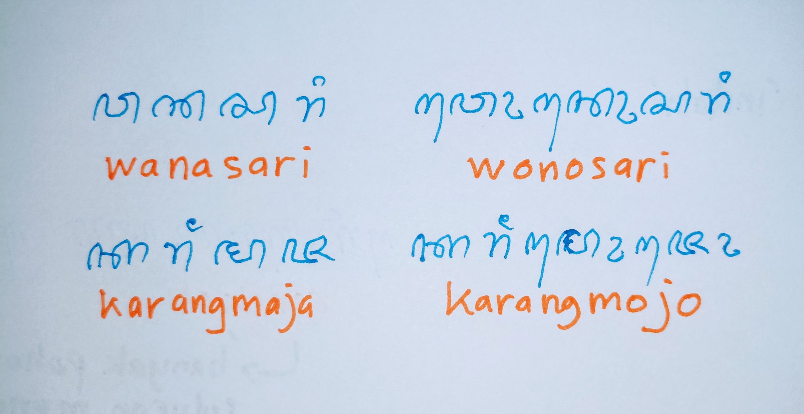 Saya mengajak Panjenengan menengok bahasa Indonesia sebagai bahasa nasional ‘bangsa Indonesia’ terlebih dulu, yang di dalam dirinya (bahasa Indonesia itu) terdapat ‘nasionalisasi’ bahasa-bahasa milik bangsa-bangsa se-Nusantara, termasuk ‘bahasa daerah’ bahasa Jawa yang dimiliki bangsa Jawa. Kata nation, sepadan dengan wangsa di bahasa Jawa, persis dengan bangsa di bahasa Indonesia. Panjenengan juga tahu, bahwa cara pengucapan fonem /w/ dan /b/ berdekatan sehingga di beberapa momentum kedua fonem ini saling menggantikan, untuk tak mengatakan bahwa fonem /w/ di bahasa asal/Jawa digantikan fonem /b/ di bahasa Indonesia. Begitu halnya /w/ dan /b/ pada {purwa} dan {purba}. Sebelum dinasionalkan, bangsa Jawa sudah menggunakan bahasa dan aksaranya sendiri, merujuk pada Aksara Carakan Jawa yang lumrah disebut Aksara Hanacaraka. Aksara Carakan Jawa yang berjumlah 20 (plus aksara Rekan) semuanya hadir bersama dengan suara vokal /ɔ/ yang tertulis /a/: /ha/ ([hɔ]), /na/ ([nɔ]), /ca/ ([cɔ]), /ra/ ([rɔ]), /ka/ ([kɔ]), dan seterusnya. Aksara Jawa bersuara. Suara /ɔ/ di sistematika aksara Jawa ini sama dengan suara /ɔ/ pada kata {gorong-gorong} [gɔrɔŋ- gɔrɔŋ] di bahasa Indonesia. Setelah kata-kata yang dimiliki bangsa Jawa dinasionalkan dengan cara diserap atau diadaptasi, maka beberapa di antaranya mengalami perubahan bentuk penulisan karena disesuaikan dengan cara pengucapan ‘bahasa nasional bahasa Indonesia milik bangsa Indonesia’ atau ‘Melayu’. Yang paling sering mengalami perubahan bentuk adalah kata-kata yang memiliki vokalisasi /a/ dan tersuarakan /ɔ/ seperti {wanasari} — {wonosari} itu tadi. Bahkan, hampir semua kata yang didalamnya memiliki vokalisasi /a/ dan tersuarakan /ɔ/ dituliskan /o/. Beberapa fonem lain seperti /b/ dituliskan /p/, /dh/ dituliskan /d/, serta /th/ dituliskan /t/, padahal masing-masing berbeda. Di konteks lokal Gunungkidul yang berpedoman pada aksara dan bahasa Jawa, Panjenengan sangat memahami bila masing-masing fonem tersebut keberadaannya mampu membedakan arti atau makna.
